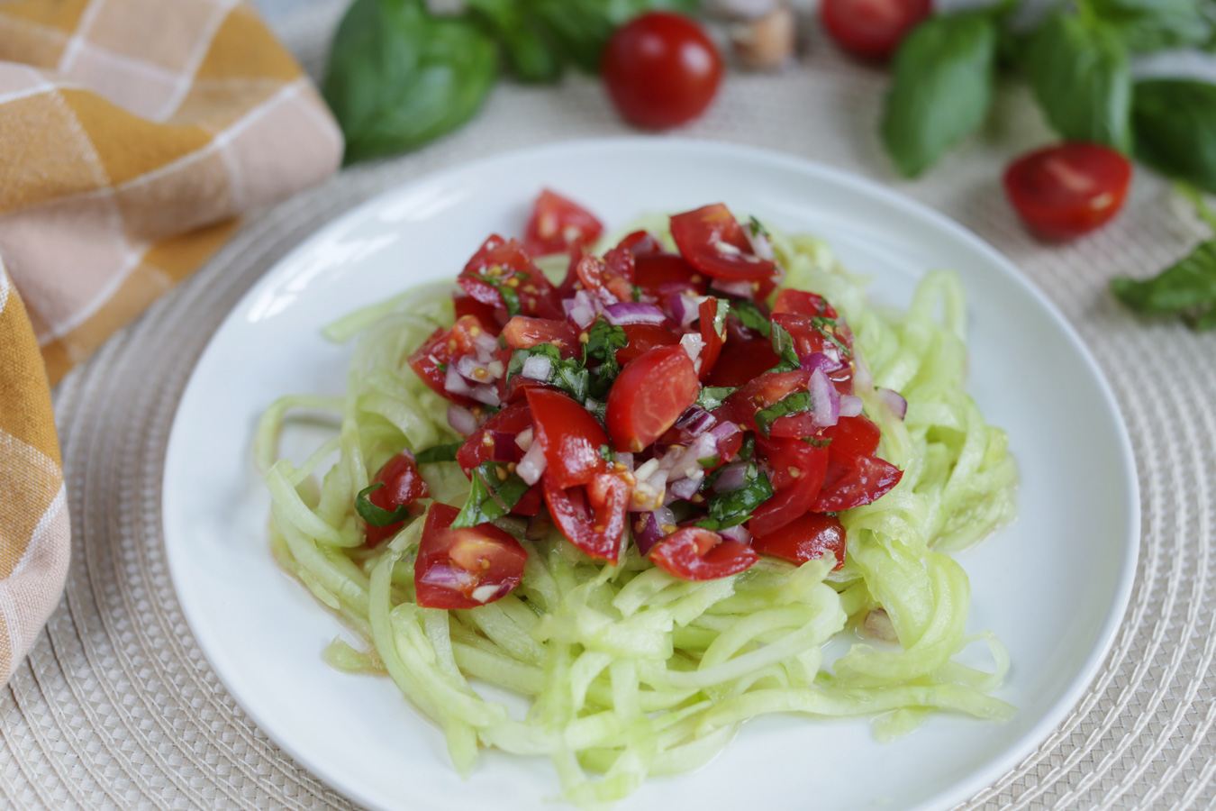 See retsept on lihtne ja lõbus viis endale ja oma lähedastele tervislikku toitu valmistada. Kurginuudlid on mõnusalt mahlased ja maitseküllane itaaliapärane tomatisalat lisab sellele värskendavale einele särtsu. Pealtnäha lihtne retsept pakatab tegelikult maitsetest – ning usu mind, sellest võib saada sinu uus lemmik. Tõsiselt!