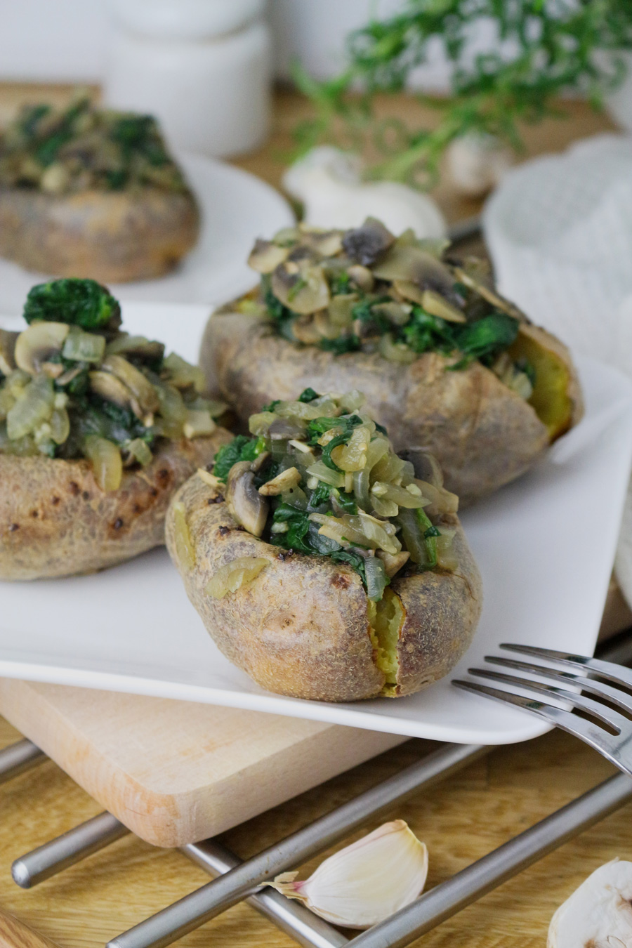 Eelkuumuta ahi 180 kraadini ning kata ahjuplaat küpsetuspaberiga. Seejärel pese ja kuivata kartulid ning aseta need küpsetuspaberiga kaetud ahjuplaadile. Ära kartuleid koori! Torka kartulitesse kahvliga mõned augud (tee 6-7 torget). Nii küpsevad kartulid paremini läbi. Aseta kartulid ahju ja küpseta 180 kraadi juures umbes 60 minutit või kuni kartulid on pehmed. Seni kuni kartulid küpsevad, valmista täidis. Selleks lisa pannile viilutatud seened. Hauta tilga vee või puljongi abil ca 7-10 minutit kuni seened on enam-vähem küpsed. Seejärel lisa hulka sibul ja purustatud küüslauk ja hauta veel 3-4 minutit aeg-ajalt segades kuni sibul on pehme. Viimase sammuna lisa hakitud spinat. Küpseta segu veel 1-2 minutit ja maitsesta.