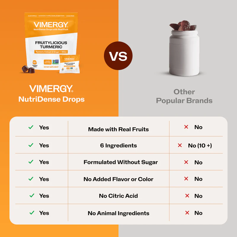 Vimergy NutriDense Drops vitamiinikommid on olemuselt teistsugused. Need närimistilgad on päris marjadest või puuviljadest valmistatud närimiseks mõeldud pektiinipõhised toidulisandid – pehmed, tervist toetavad, rahuldustpakkuvad ja maitsvad. Need on valmistatud ilma lisatud suhkrute, magusainete, želatiini, vahade, sünteetiliste värvainete, säilitusainete või maitseteta. Iga vitamiinikomm on valmistatud päris koostisosadest nagu terved puuviljad/marjad, vesi ja ravimtaimed.